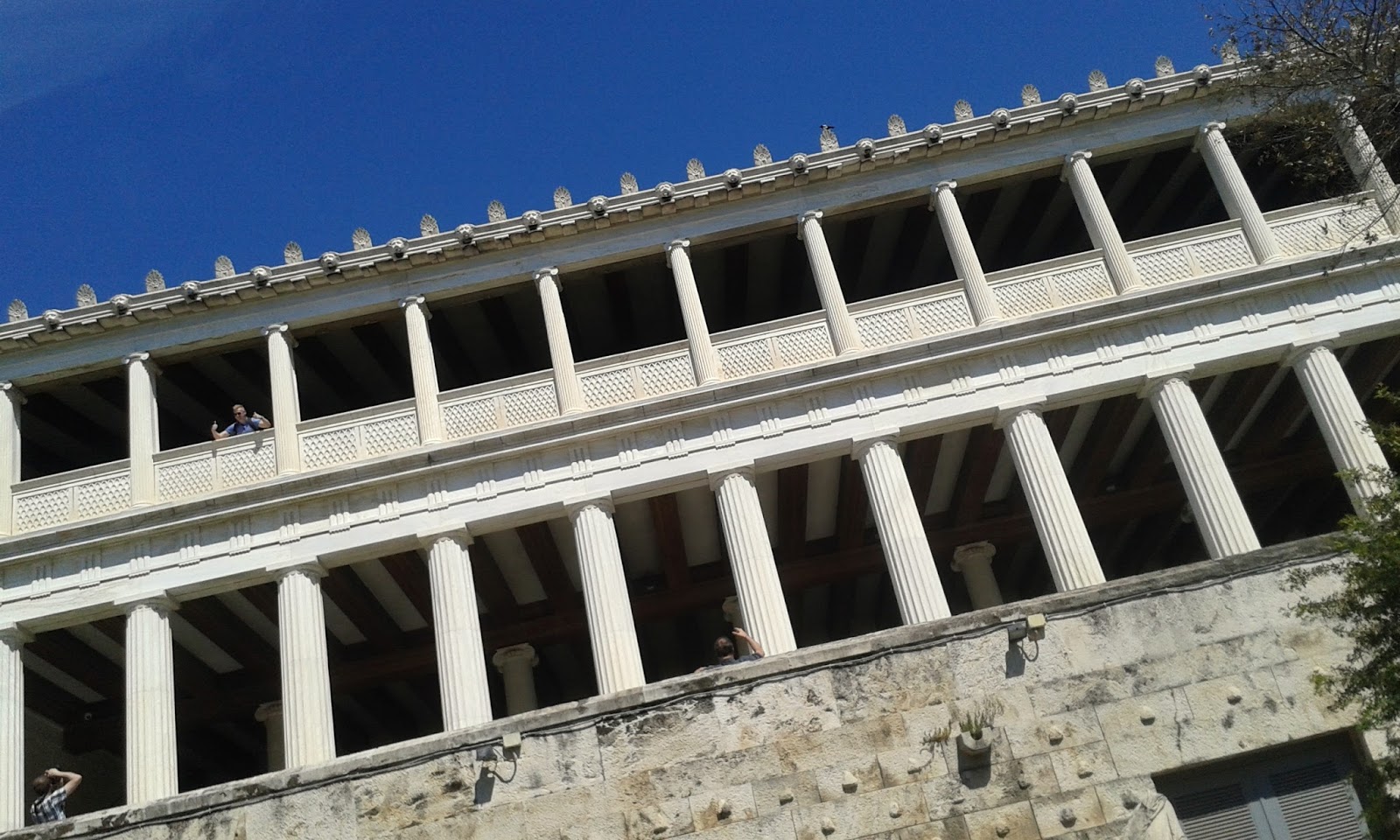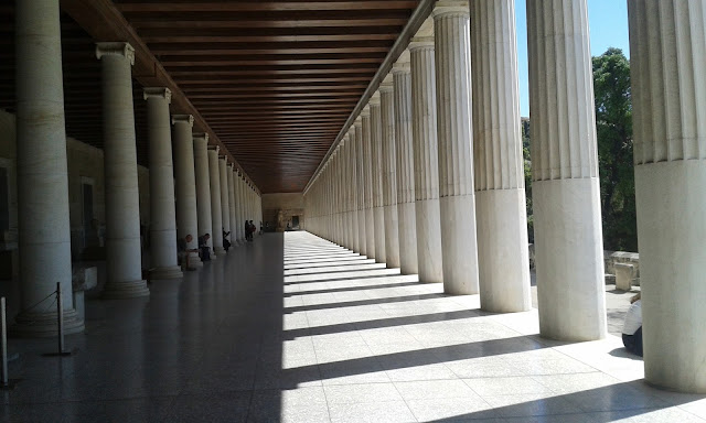 Stoa Attalosa to kolejny punkt wycieczki u podnóża Akropolu. Stoa to podłużna hala, która z jednej strony miała ścianę, natomiast wzdłuż drugiej budowane były kolumny. Takie budowle służyły w starożytnej Grecji za miejsca handlu lub załatwiania spraw administracyjnych. Obecnie Stoa Attalosa przekształcona została w muzeum. Ze względu na wstręt Mata do wszelkiego rodzaju obrazów, rzeźb i obiektów muzealnych, dosłownie przebiegliśmy przez halę kolumnową...