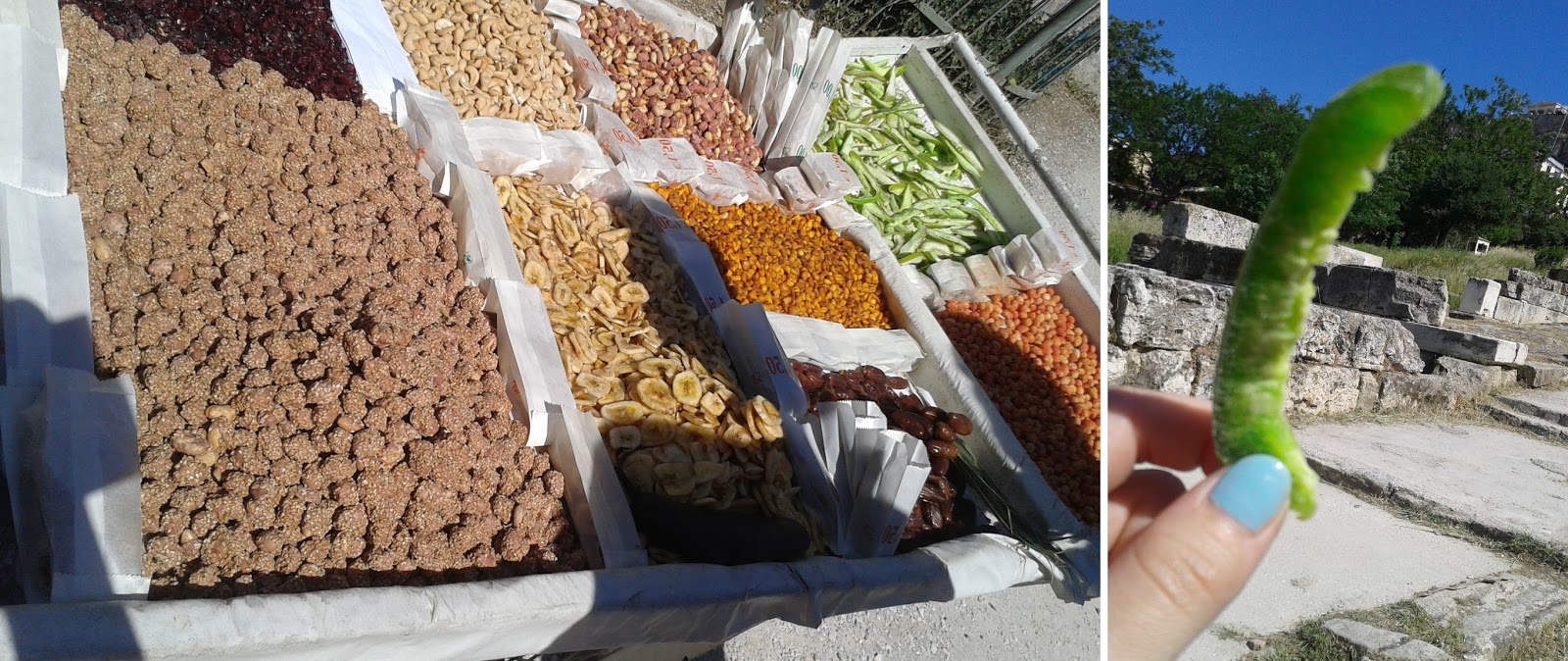 2/3 z naszej wycieczki pamiętało smak soczystych owoców, które zajadało w Hiszpanii. Były więc podstawy by podejrzewać, że równie wyjątkowe będą greckie owoce. By to sprawdzić, w drodze powrotnej z Pireusu zatrzymaliśmy się przy straganach spożywczych. Pomarańcze prosto z drzewa, z nieoderwanymi listkami, prezentowały się zdecydowanie lepiej niż "polskie" okazy w supermarkecie. Podobnie było z oliwkami, arbuzami i innymi śródziemnomorskimi cudami. Jednak smak bananów i pomarańczy nie odbiegał od tego, do którego jesteśmy przyzwyczajeni. Być może byliśmy w Grecji za wcześnie, być może majowe owoce nie są jeszcze dostatecznie nasycone słońcem.