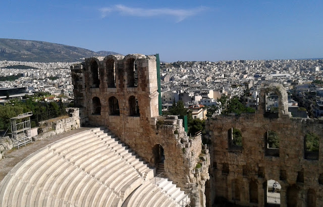 Ze skórkami w dłoniach rozpoczęliśmy wspinaczkę do najbardziej znanej części Akropolu. Po drodze minęliśmy jeszcze odeon Heroda Attyka. Herod Attyk to rzymski polityk i mąż stanu, który zbudował teatr w hołdzie swojej zmarłej żonie. Co ciekawe, w odeonie nadal odbywają się przedstawienia sceniczne. Podczas odbywającego się co roku Festiwalu Ateńskiego wystawiane są tu różnego rodzaju spektakle.