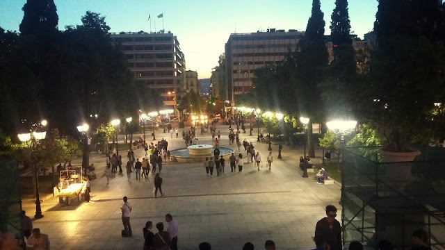 Nasza wycieczka rozpoczęła się w piątek, 9. maja. W Atenach wylądowaliśmy późnym wieczorem, dlatego noc z piątku na sobotę spędziliśmy na lotnisku. Niewielki problem pojawił się rano, gdy próbowaliśmy dostać się do miasta. Pani na dworcu chyba sama nie wiedziała jak i skąd dokładnie mieliśmy wyjechać. Dopiero przypadkowo zapytany starszy pan pokierował nas na właściwy autobus, którym za €5 dostaliśmy się do Aten w ok. 50 minut. Nocleg mieliśmy zarezerwowany w hostelu Aristoteles, niedaleko placu Omonia – najniebezpieczniejszej ateńskiej dzielnicy. W komentarzach, które czytaliśmy przed wylotem do Grecji, wielu podróżników przestrzegało przed tą właśnie dzielnicą. Jednak ze względu na dobrze połączenie z miejscami, które chcieliśmy odwiedzić, zdecydowaliśmy się na rezerwację w Aristotelesie. Zresztą, to tylko na jedną noc. Do hostelu dotarliśmy dużo za wcześnie, nasz pokój nie był jeszcze przygotowany, dlatego kilka chwil musieliśmy na niego poczekać. Po odebraniu klucza duże rozczarowanie spotkało Mata, któremu obiecywano pokój z balkonem na którym rano wypije kawę. Otrzymaliśmy bowiem pokój z jednym oknem, z którego widać było... "plecy" następnego budynku. Dość smutny widok.